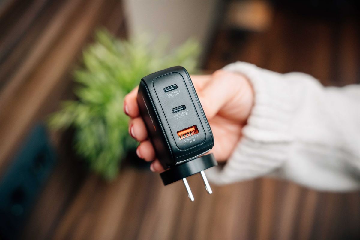 Nabíječka poskytuje celkový výkon až 65 W a je vybavena dvěma porty USB-C a jedním portem USB-A.