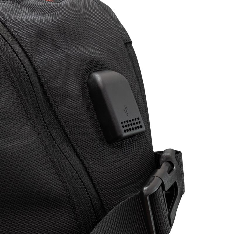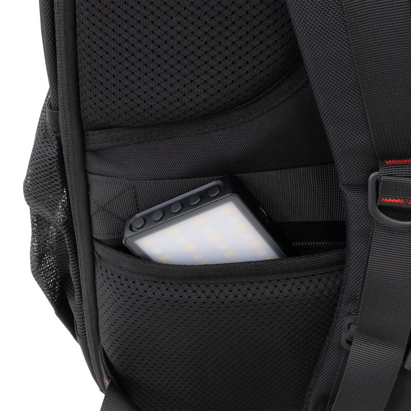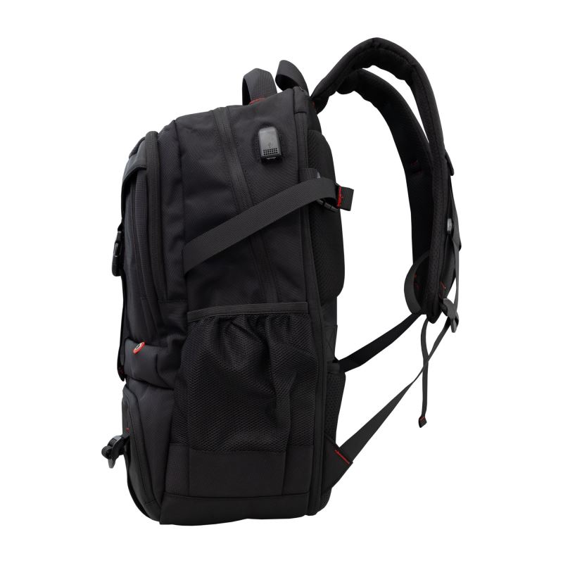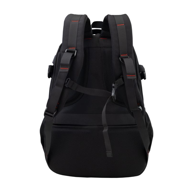 Design v černé barvě s červenými detaily podtrhuje herní charakter batohu.
