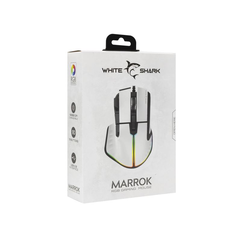 White Shark herní myš MARROK, čipset SUNPLUS 6662, rozlišení 12.000 DPI, s ergonomickým designem, RGB osvětlení s 16,8 M barvami.