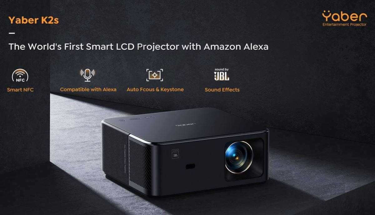YABER K2s - Domácí kino nové generace, stereo reproduktory JBL repro, 800 ANSI lumenů, podpora Dolby Audio, kompatibilní s Alexou.
