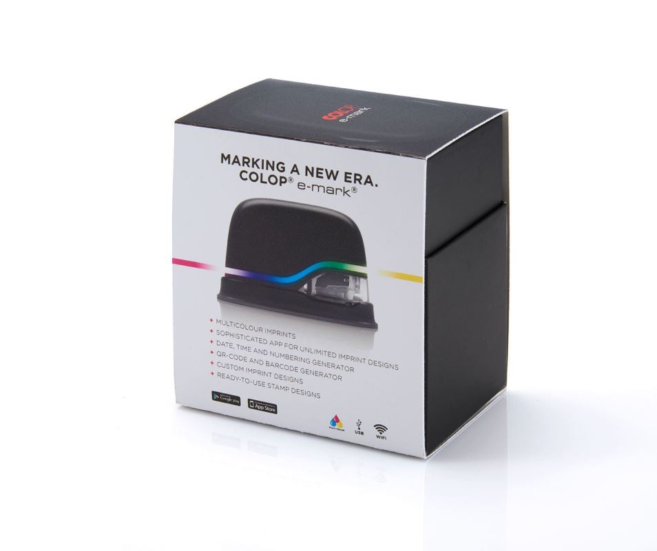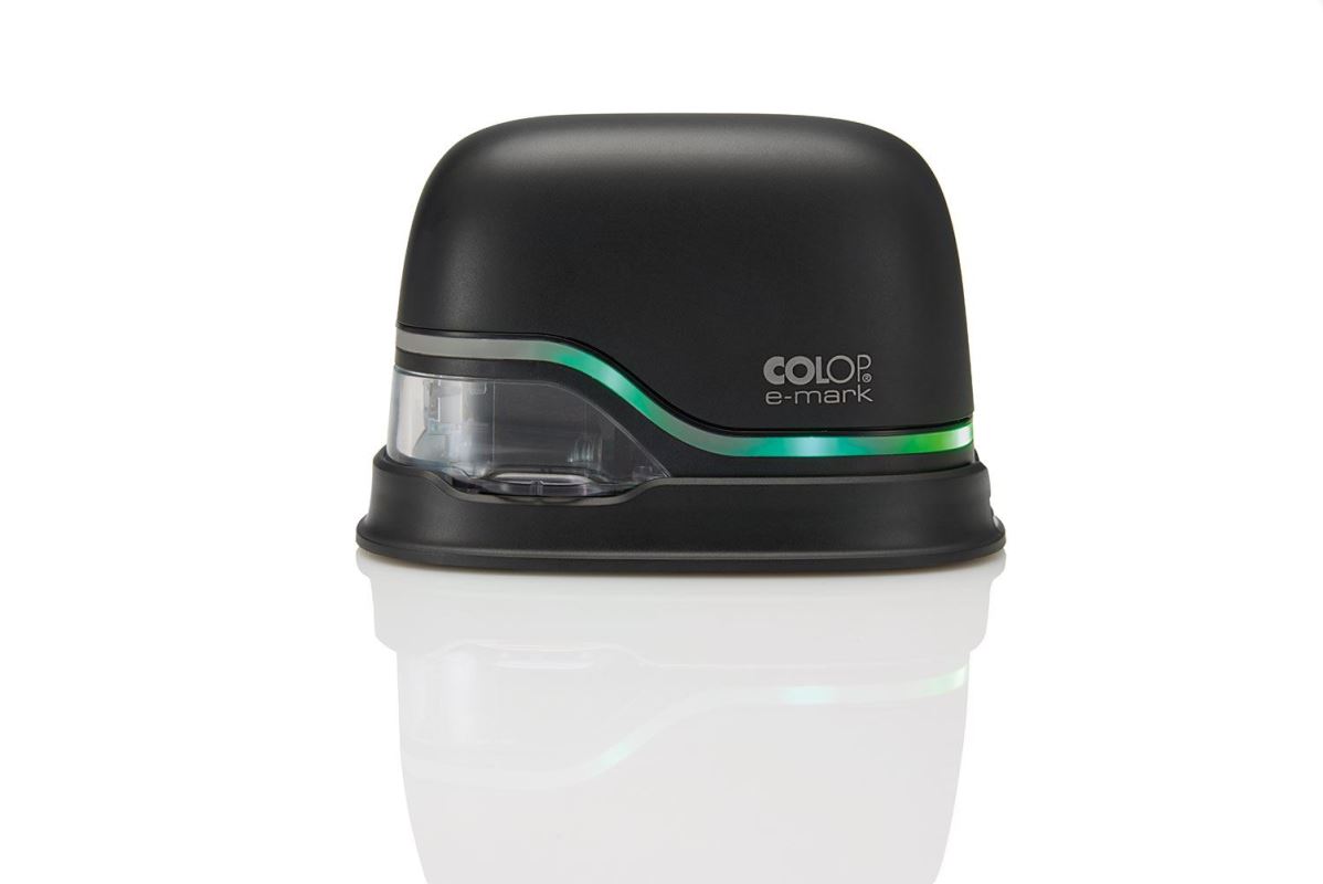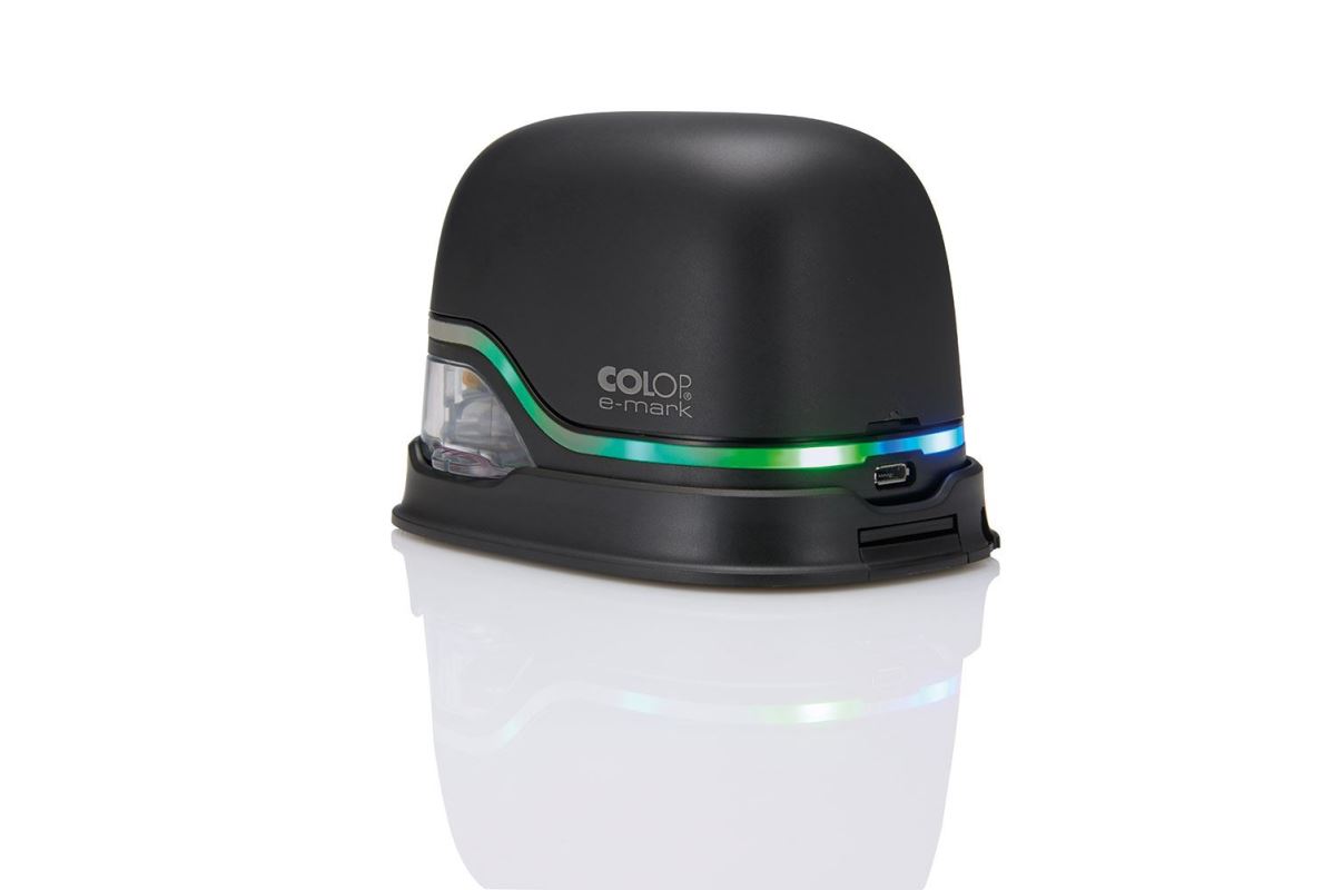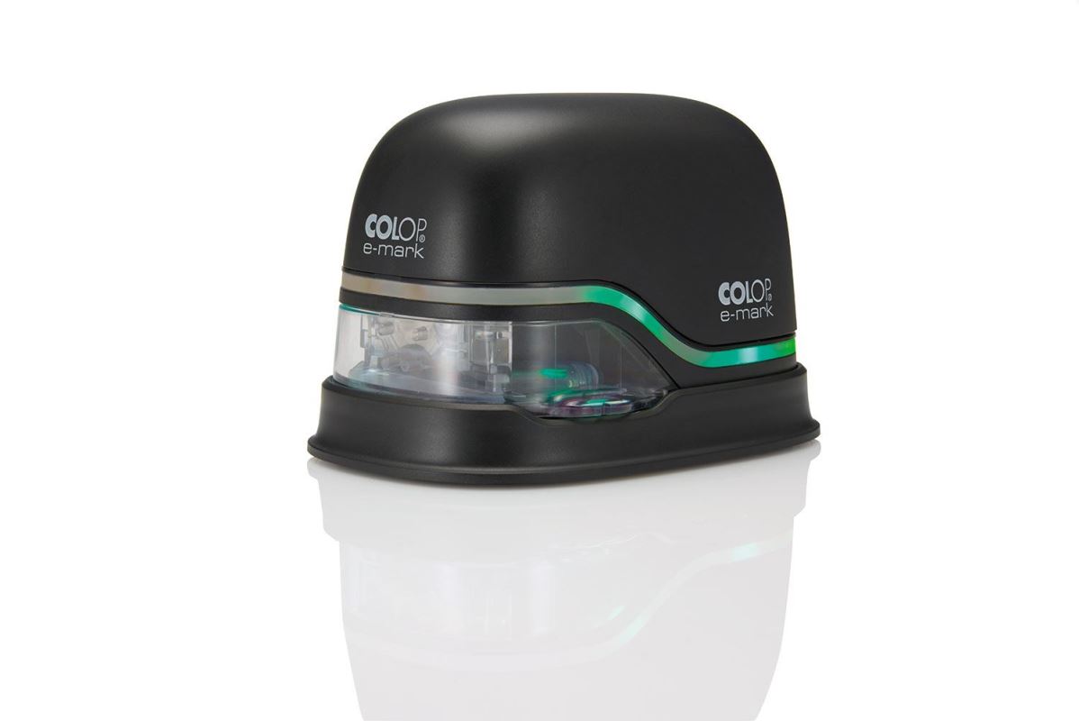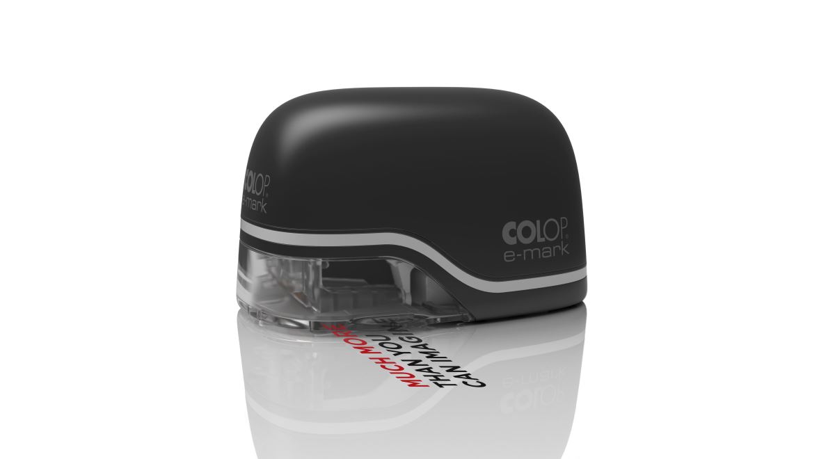 The e-mark is an electronic and mobile (battery-powered) marking device to create and change own imprints and print them by an easy sideways movement. Operated through an App on a mobile device or stationary computer, almost unlimited designs, ready-to-us