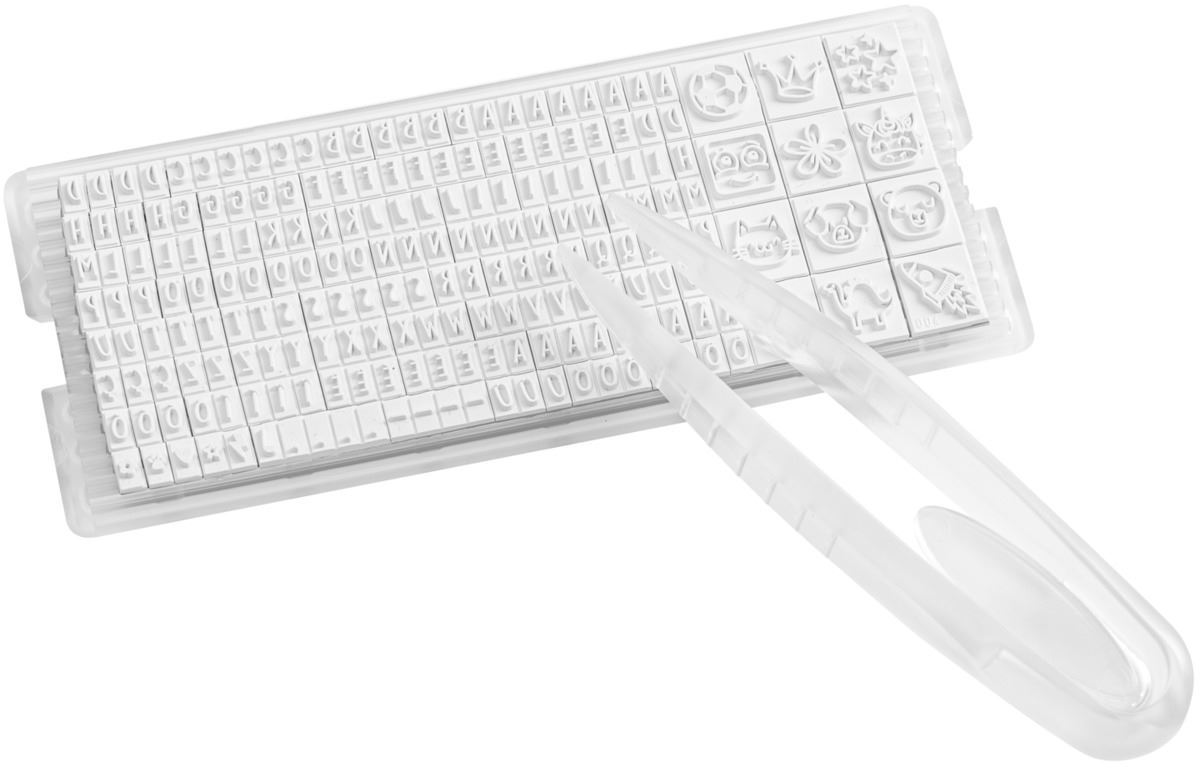 Simply take Marky out of the packaging, remove the cover and use the enclosed tweezers to easily place the letters and pictograms contained in the type set to create the desired imprint. A clear advantage, especially for families with several children, is that it can be redesigned and customised again and again in just a few minutes. The black ink pad with textile ink is already inserted in the stamp.
