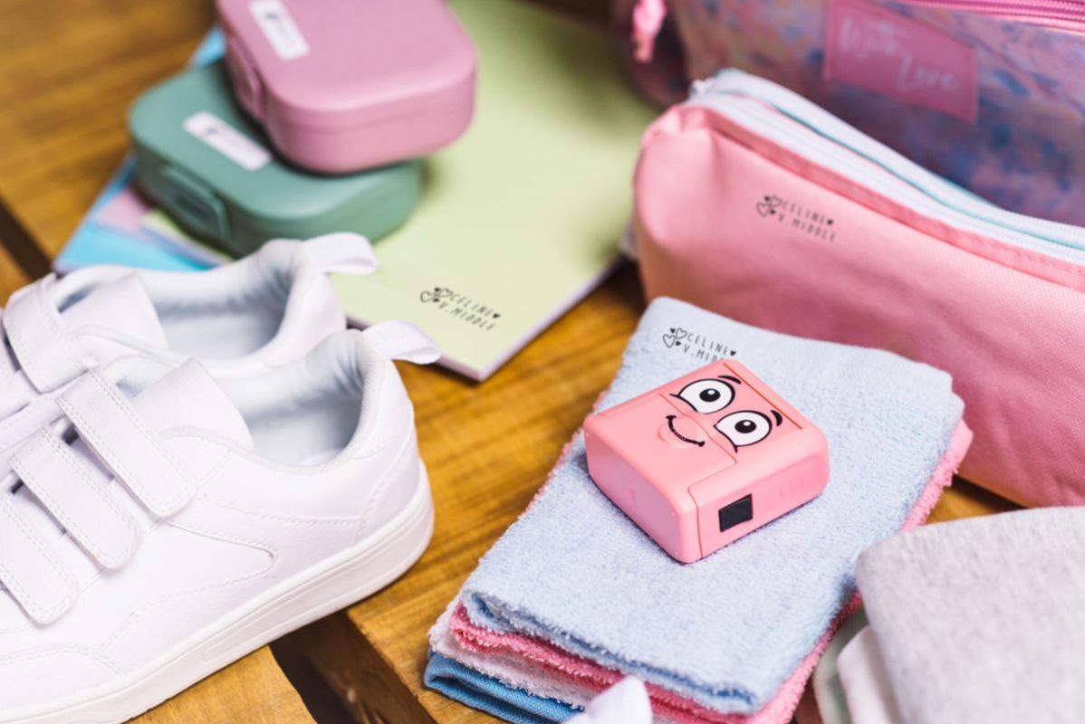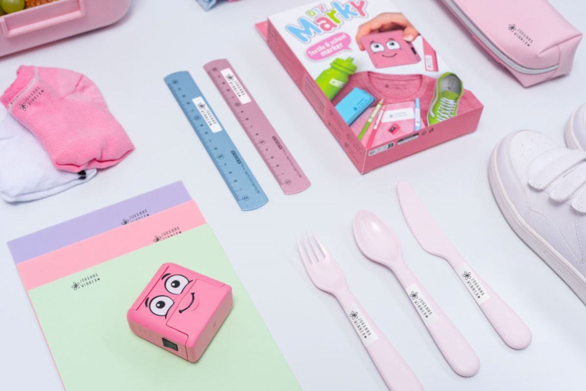 Marky, produced in Austria, is available in three trendy colours: pink, light blue and green. The set comes in attractive cardboard packaging and includes the stamp with a friendly face, a type set (with all the letters of the alphabet and funny pictograms), tweezers, iron-on tape for dark fabrics and dishwasher-safe labels. The cover included with the stamp ensures that you can take it anywhere without running the risk of getting it dirty.
