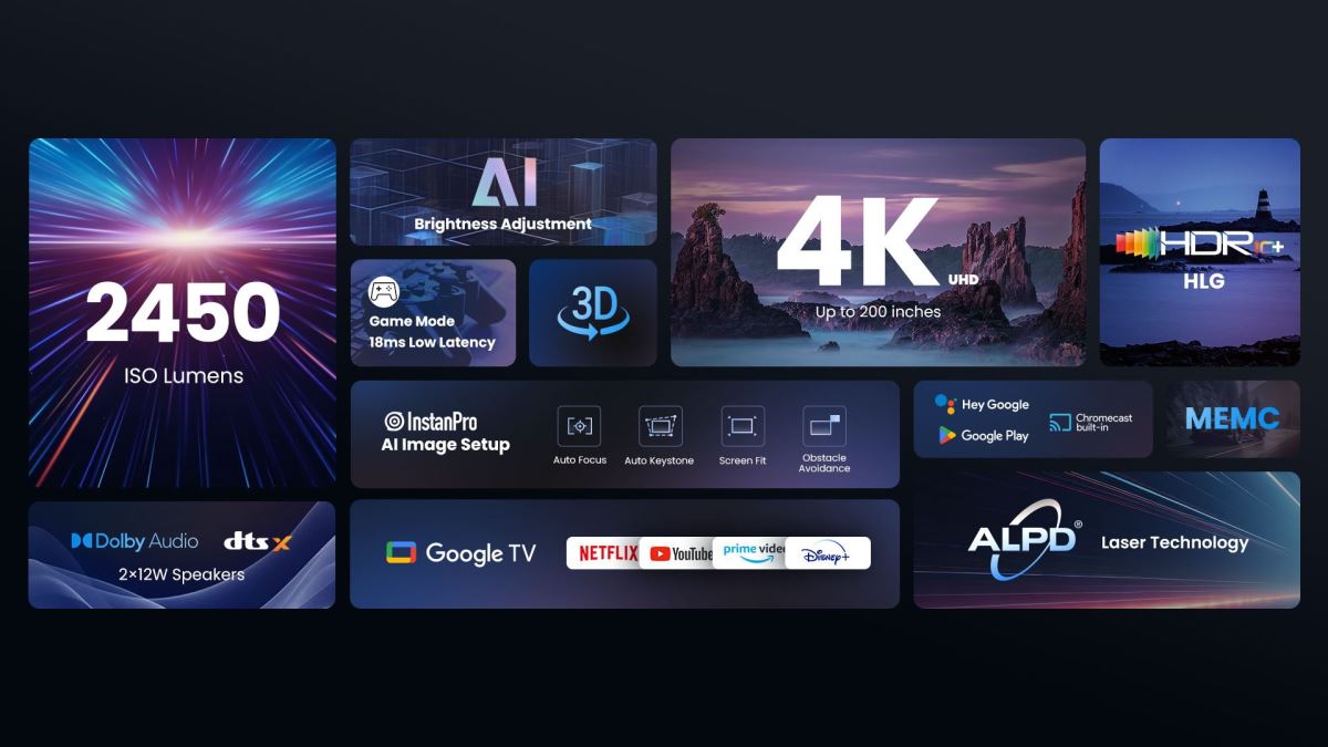 With a brightness of 2450 ISO lumens, 4K resolution and advanced ALPD® laser technology, this projector offers an extremely sharp and vivid image with a long lamp life of up to 30,000 hours.