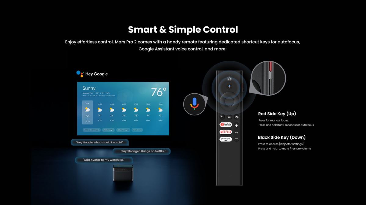 Enjoy effortless control. The Dangbei DBOX02 comes with a handy remote control with dedicated hotkeys for autofocus, Google Assistant voice control and more.