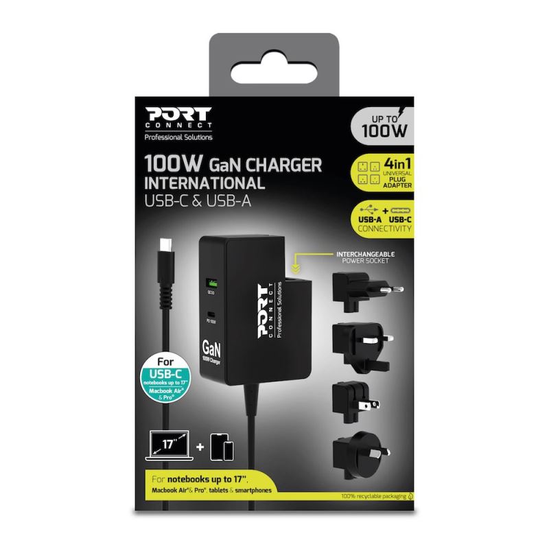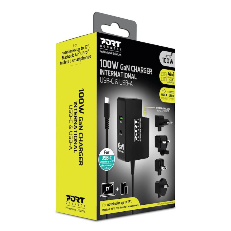 PORT CONNECT GaN Charger Travel Universal USB-C a USB-A, 100 W, Black