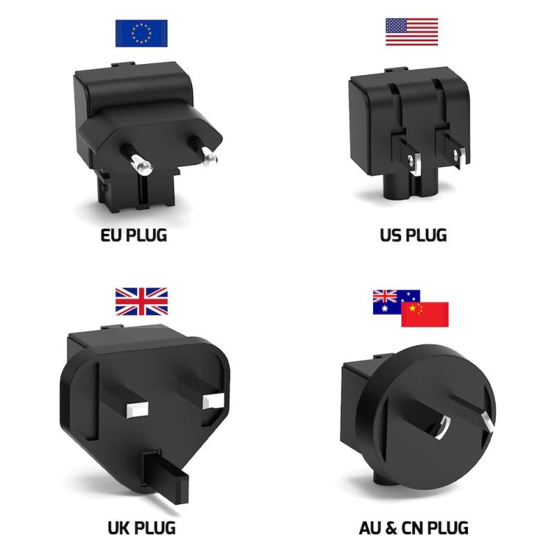 - 4x universal plugs (EU, US, UK, AU/CN)