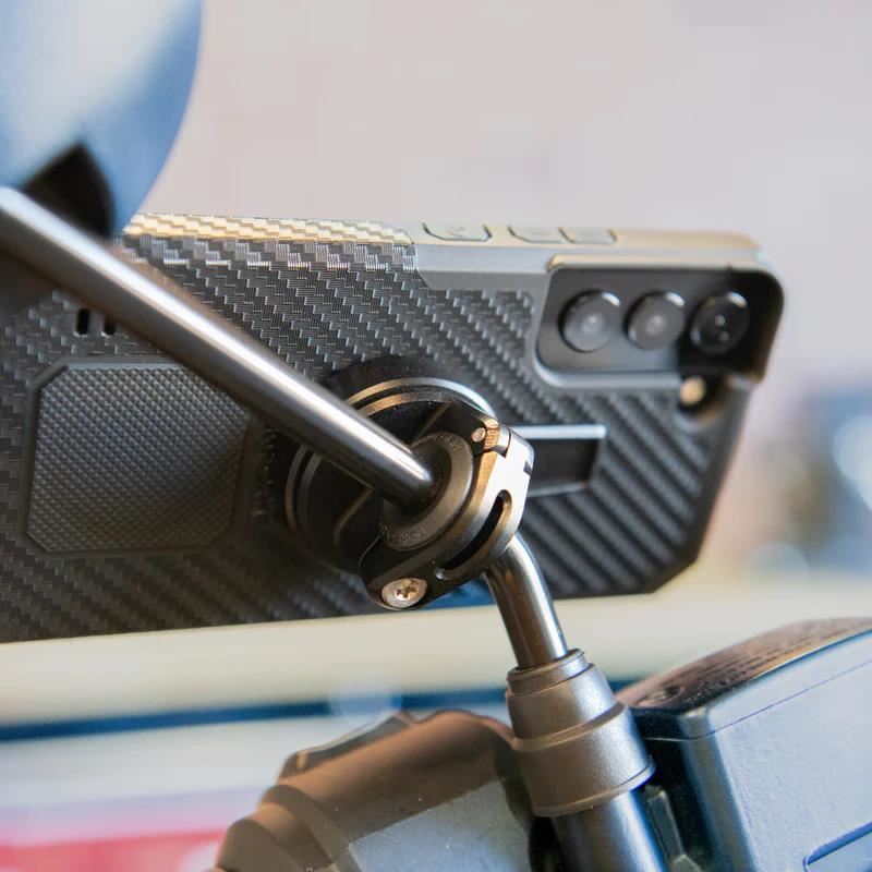 Our sturdy small bar phone mount attaches to any bar between 10mm and 16mm. It's suitable for use on any vehicle or space where there's a small bar.