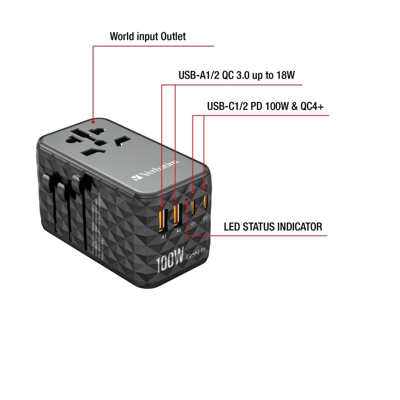 The Verbatim UTA-06 GaN III 100W Universal Travel Adapter is the perfect companion for travelers looking for fast and reliable charging of their electronic devices around the world.