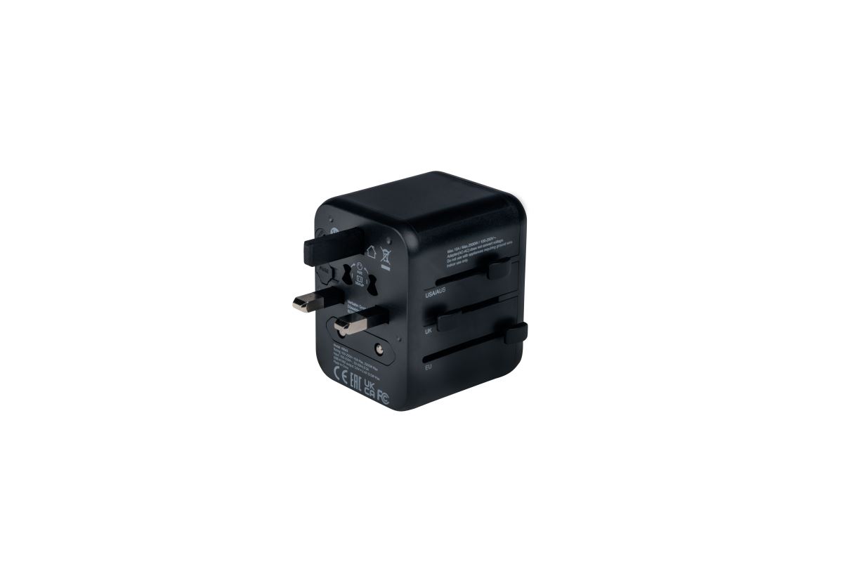 The compact and powerful Universal Travel Adapter allows simultaneous use of the AC power socket and the dual USB ports.