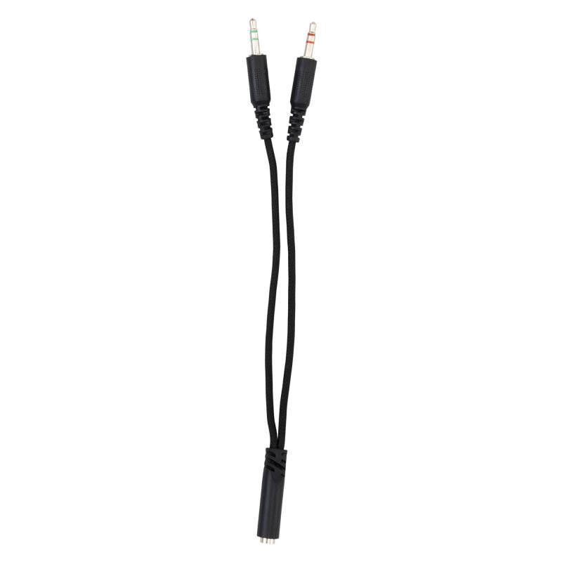 The headset uses a 3.5mm four-pin jack with an included adapter to 2× 3.5mm connector for compatibility with a wider range of devices.